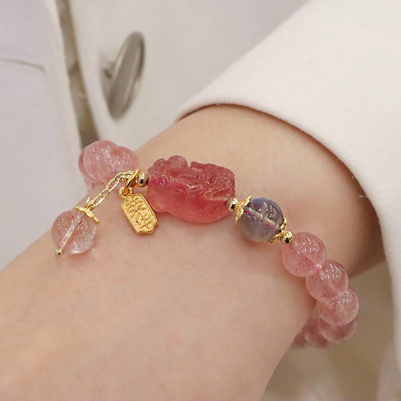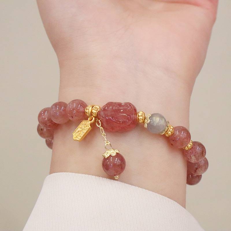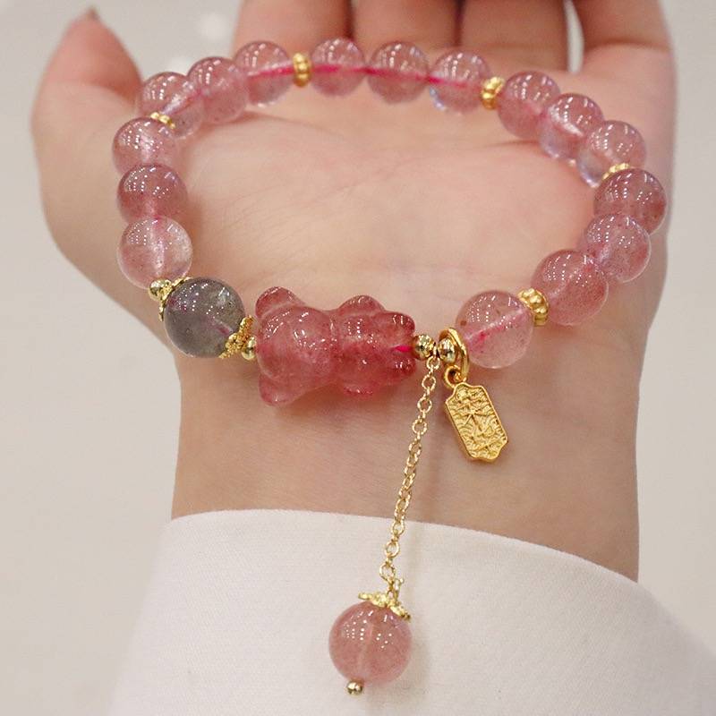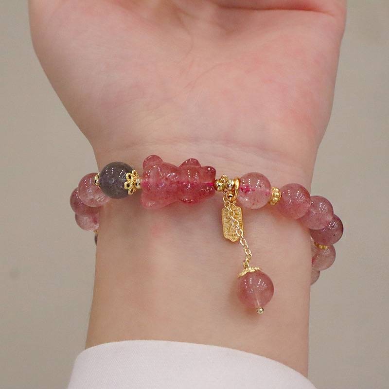 超仙天然草莓晶ins风小熊貔貅兔子手串灰月光真金电镀手链手饰品