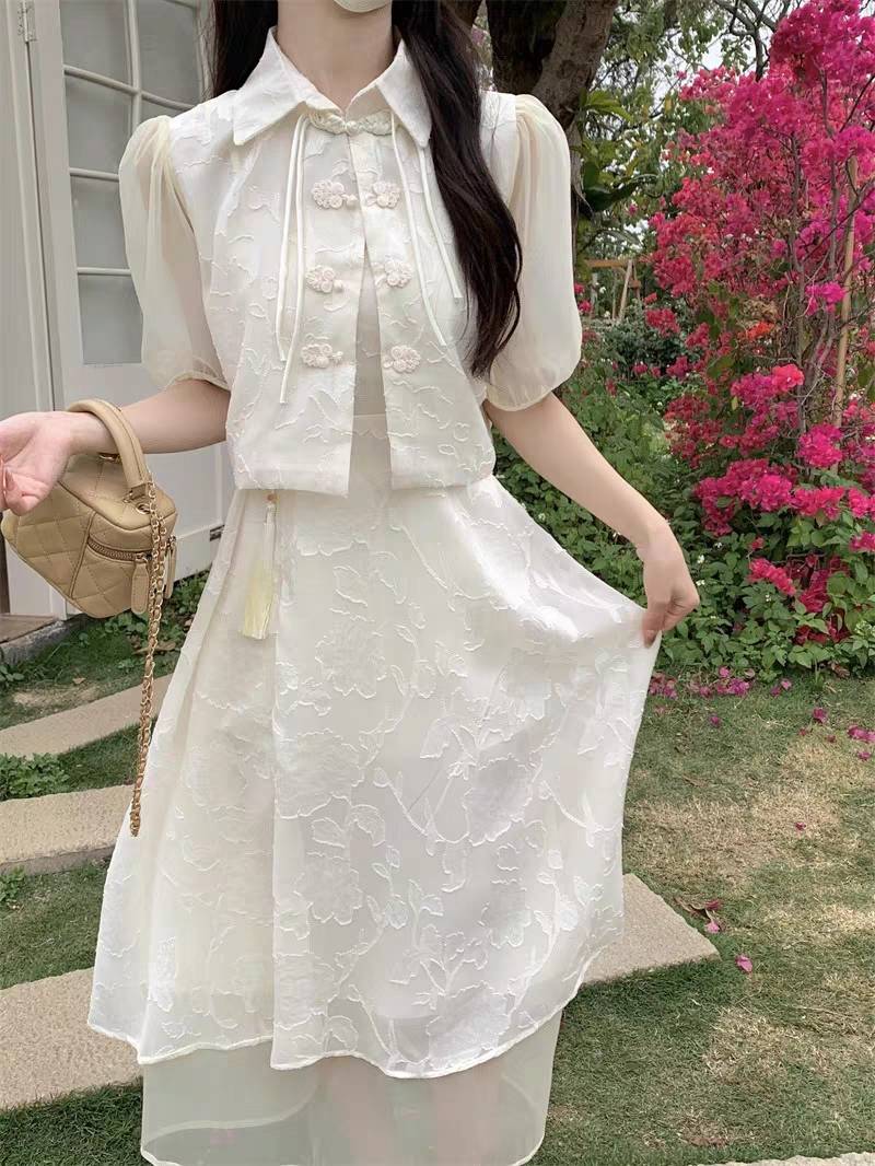 新中式设计感泡泡袖气质盘扣上衣吊带连衣裙女夏季2023新款两件套