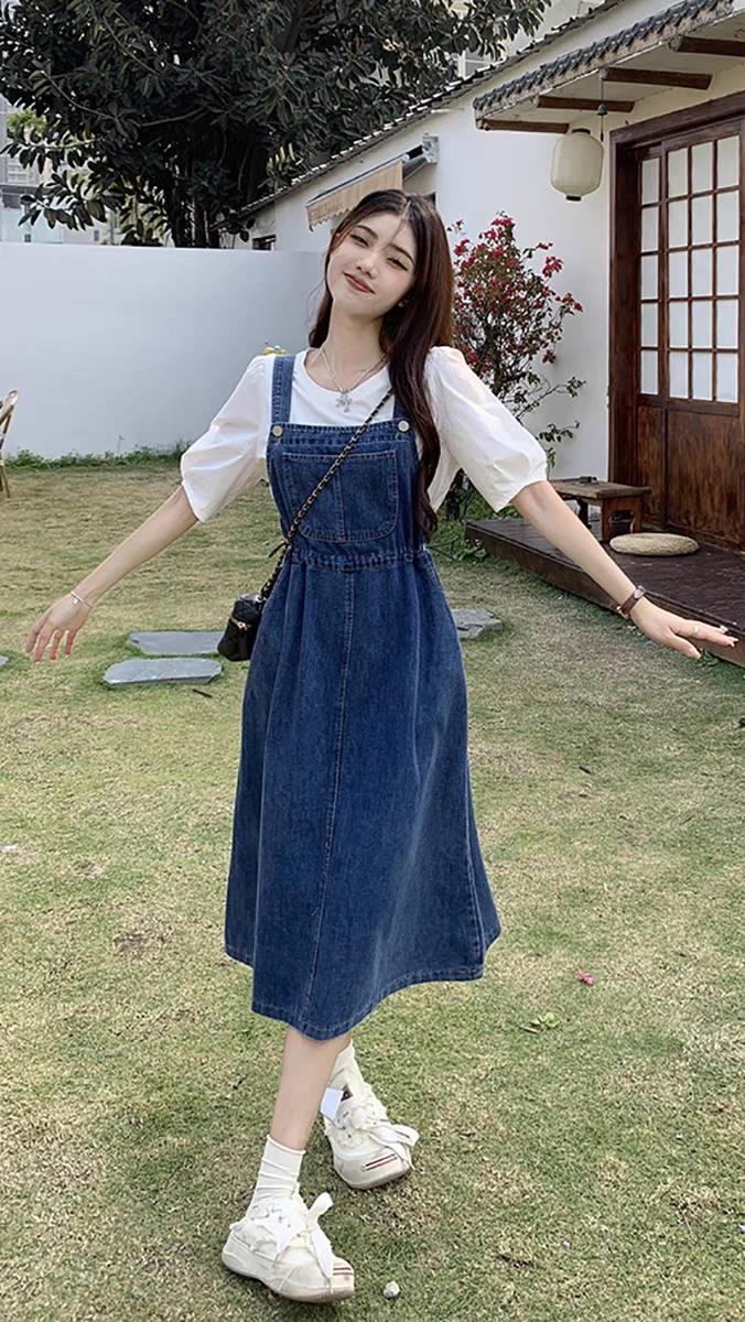 水洗牛仔连衣裙女夏季新款小个子显瘦收腰背带裙a字裙长裙子质感