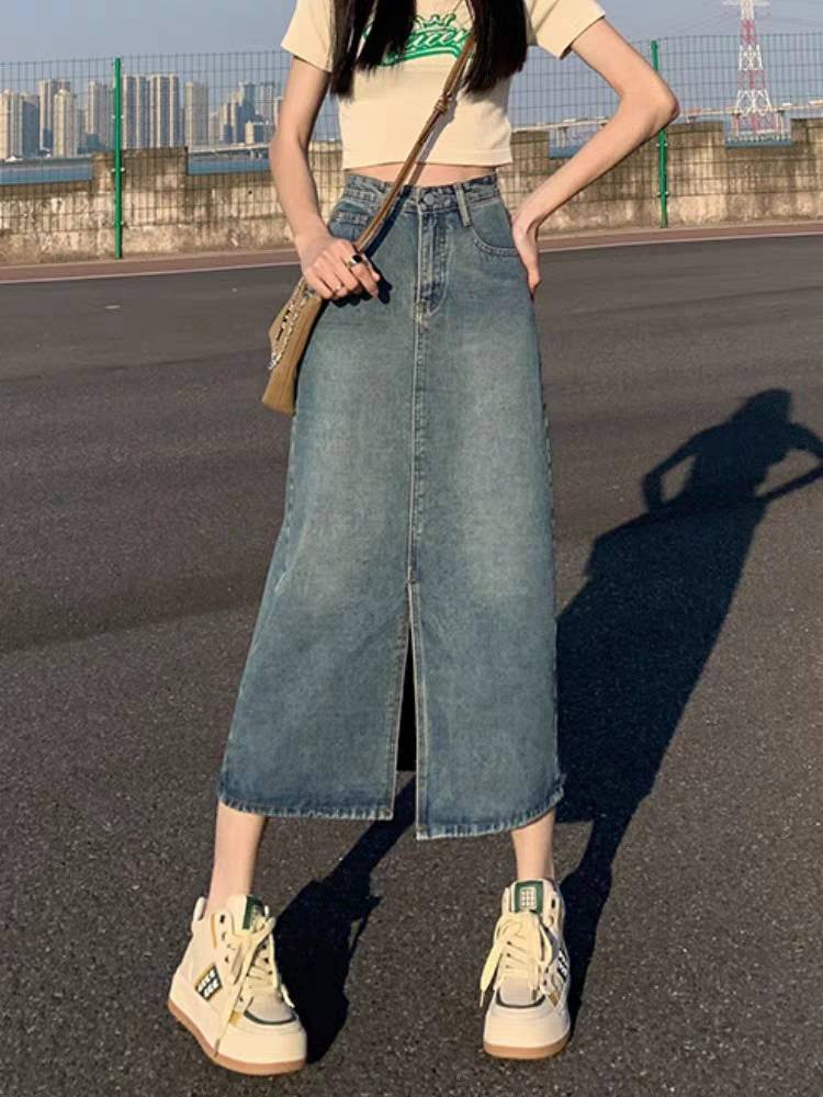 牛仔半身裙女夏高腰包臀裙春秋款新款复古直筒宽松a字中长款半裙