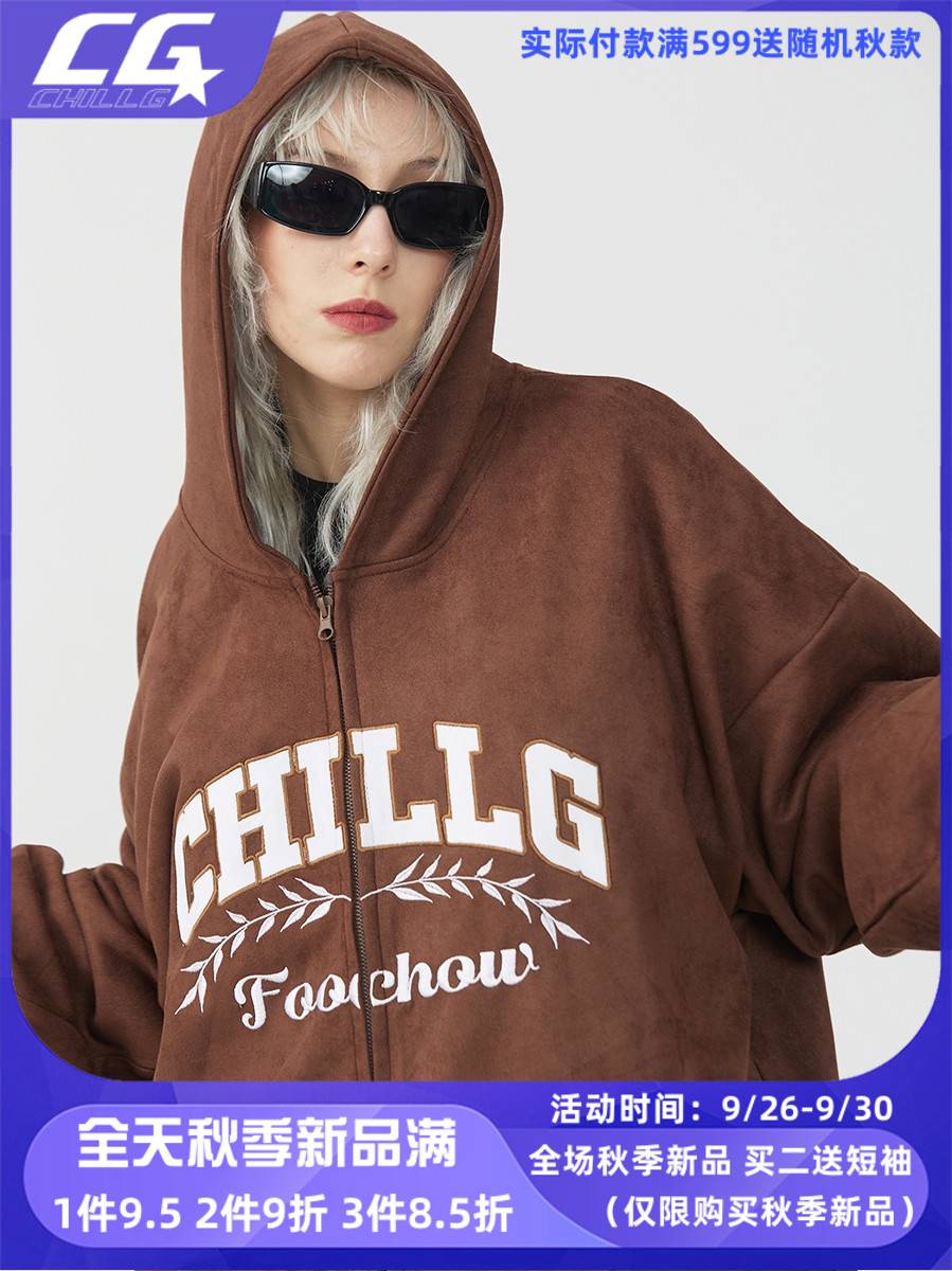 包邮CHILLG国潮牌棒球字母刺穗棕色麂皮卫衣宽松连帽开衫外套男女 299.00 已售:3件