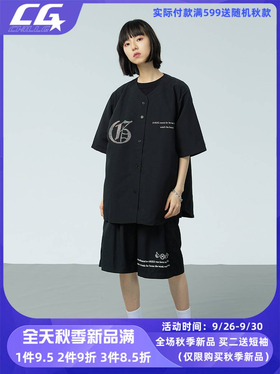 包邮CHILLG国潮牌水钻棒球衬衫vibe风夹克休闲宽松烫钻短袖上衣女 158.00 已售:1件