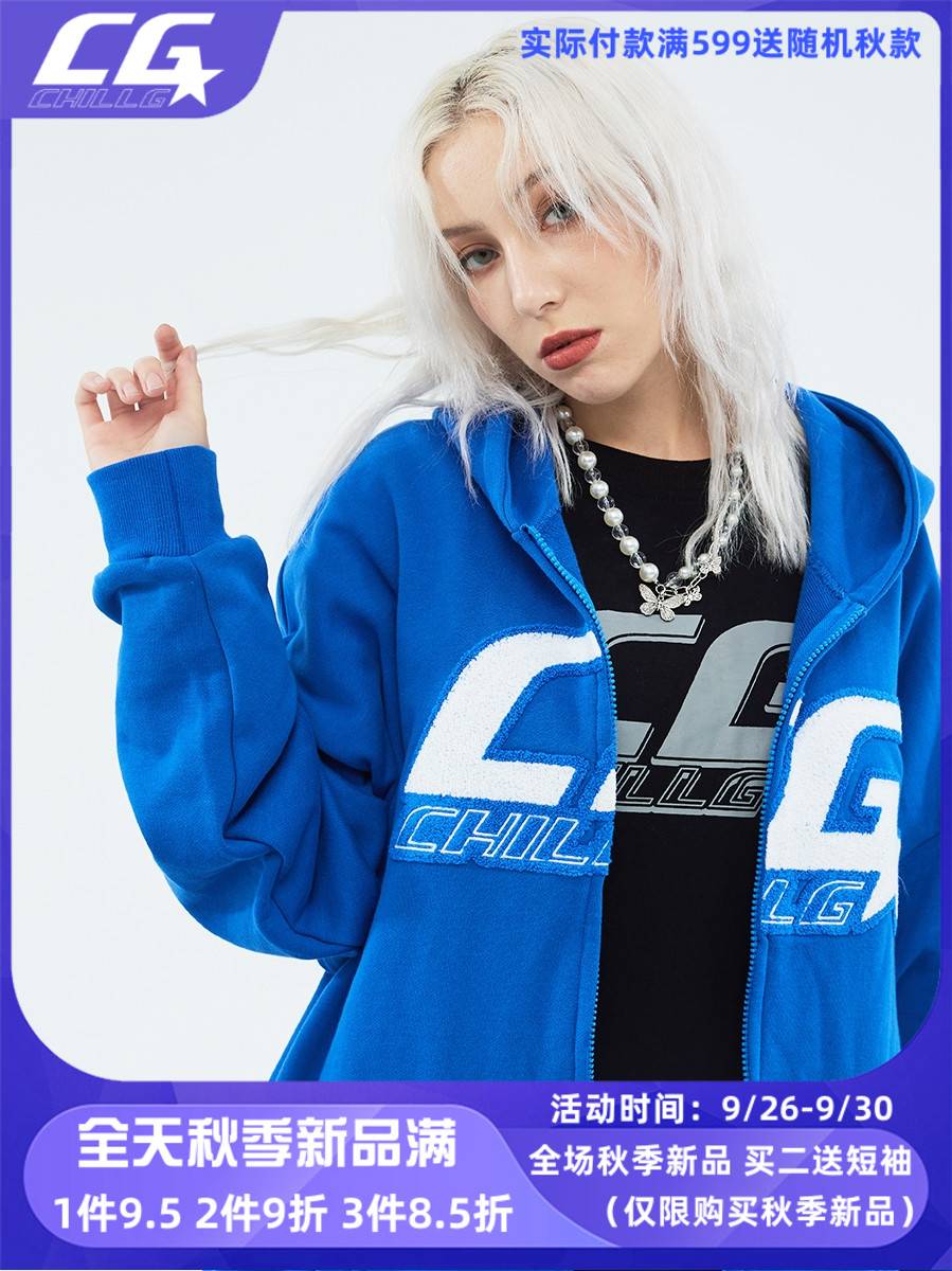 包邮CHILLG国潮牌克莱因蓝连帽衫毛巾绣字Logo高街vibe开衫卫衣 228.00 已售:0件