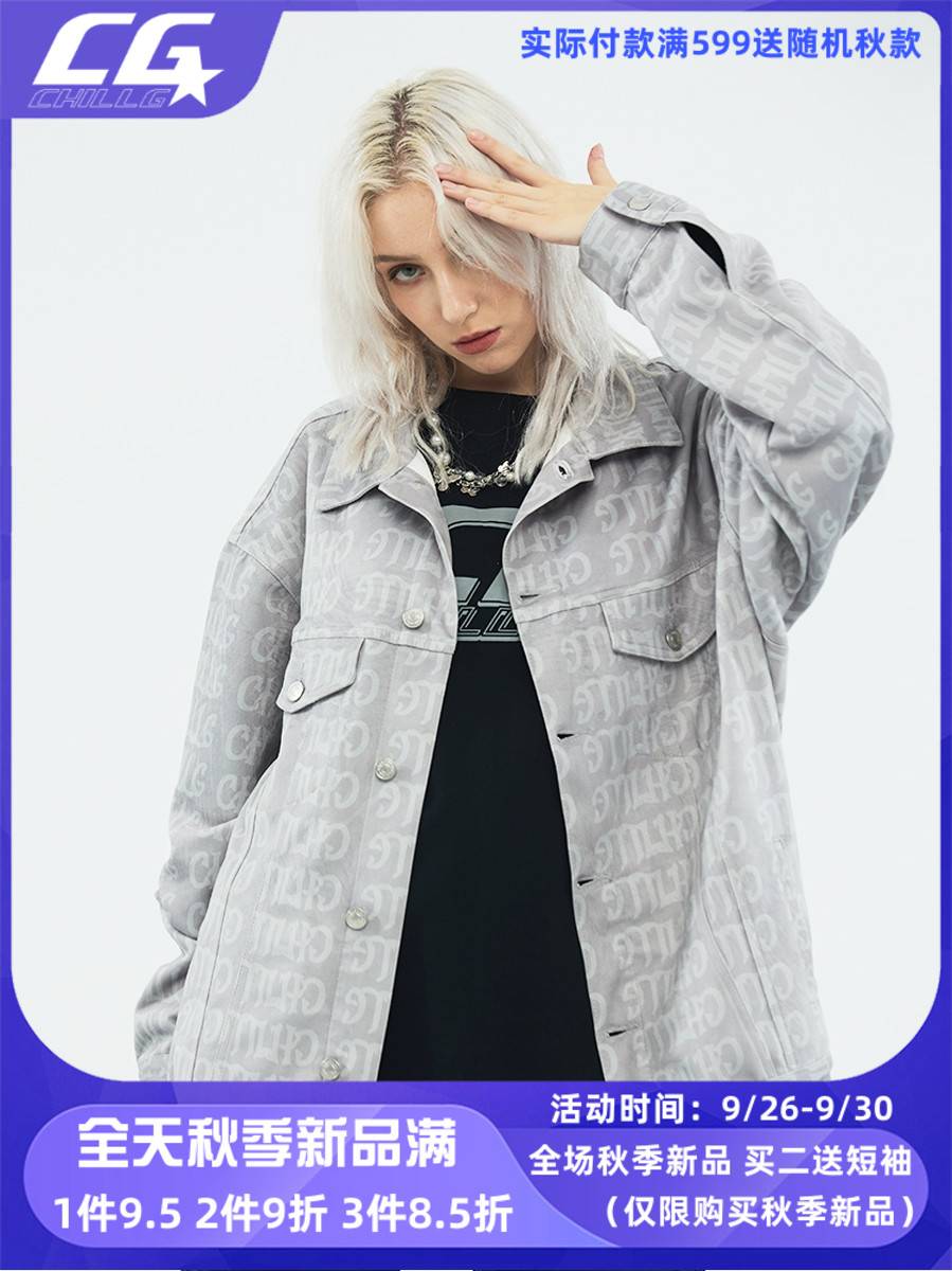 包邮CHILLG国潮牌高街头浅灰麂皮绒字母满印夹克宽松休闲外套女 308.00 已售:0件