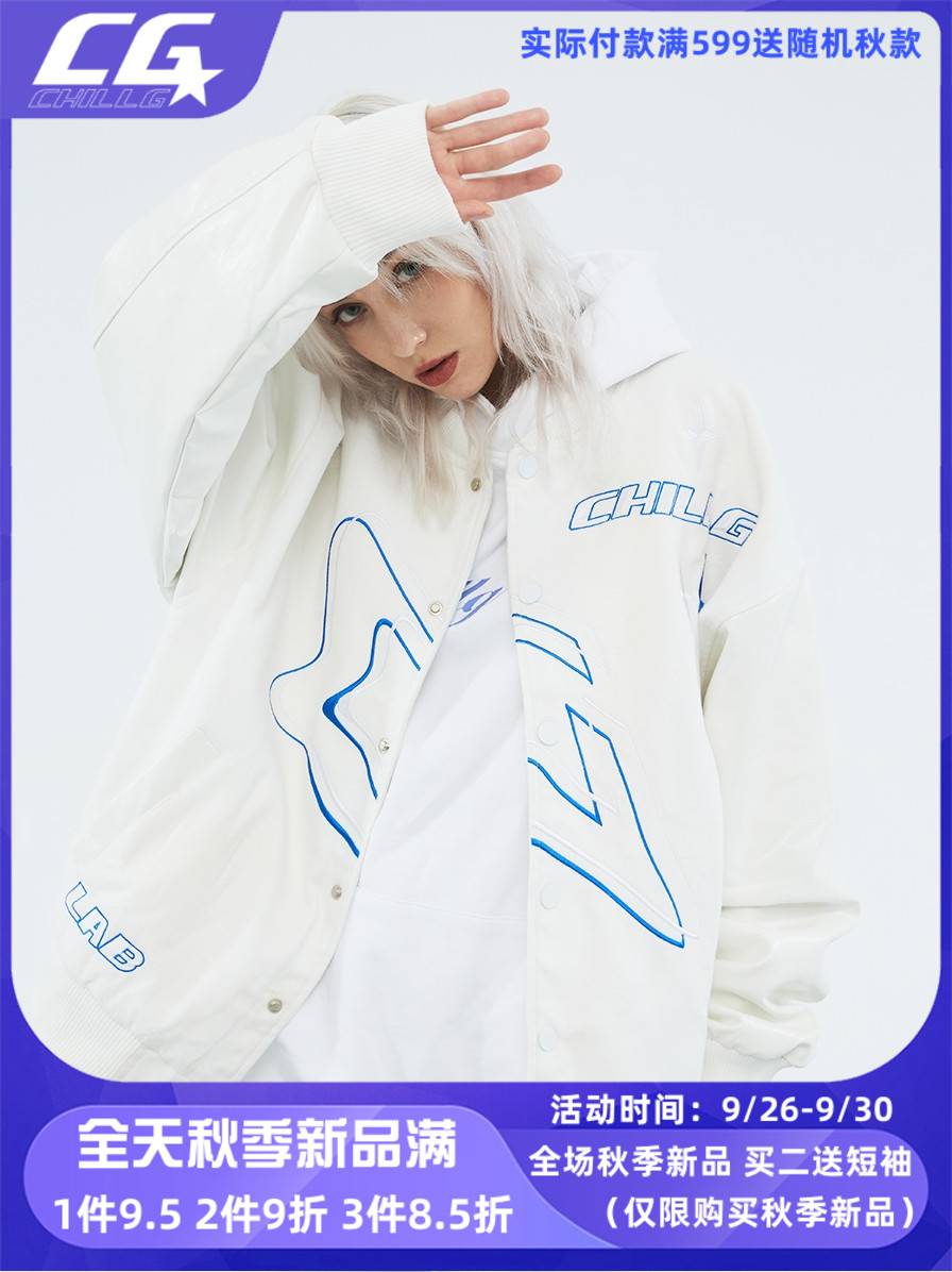 包邮CHILLG国潮街头字母刺绣logo克莱因蓝白色棒球服宽松夹克女 338.00 已售:9件