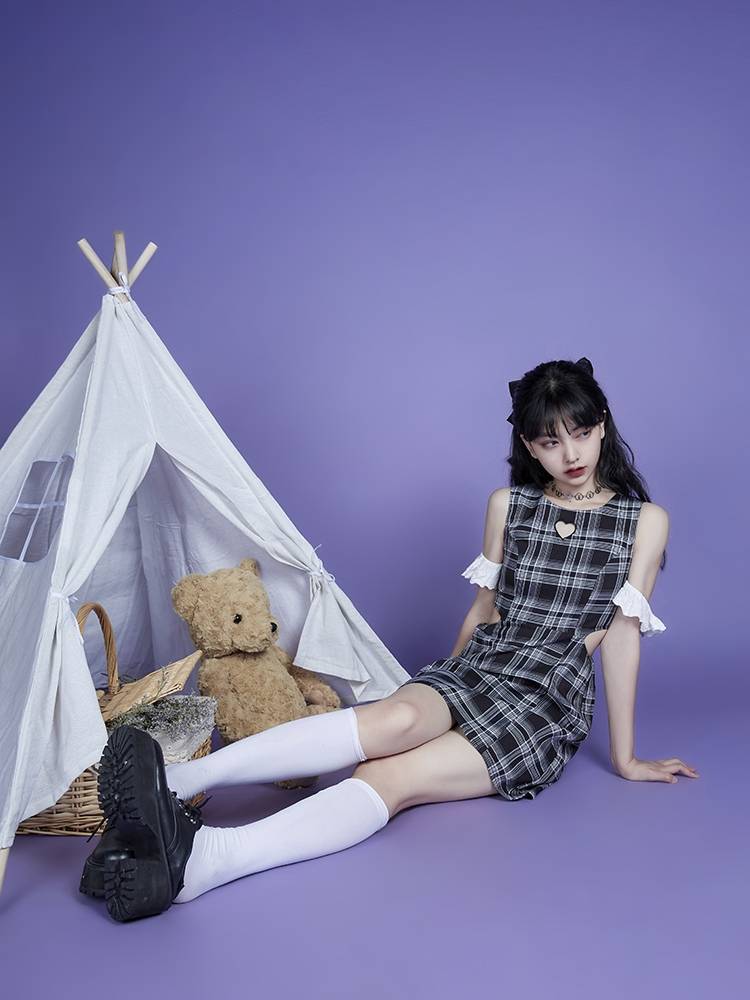黑白格镂空花边袖收腰露背绑带连衣裙甜美显瘦 109.00 已售:0件