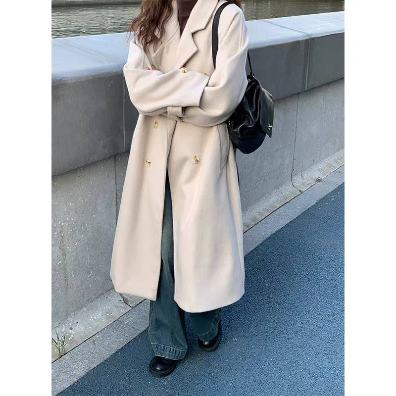 RAINY自制 腰带西装领羊毛大衣秋冬女宽松韩系高级中长款毛呢外套