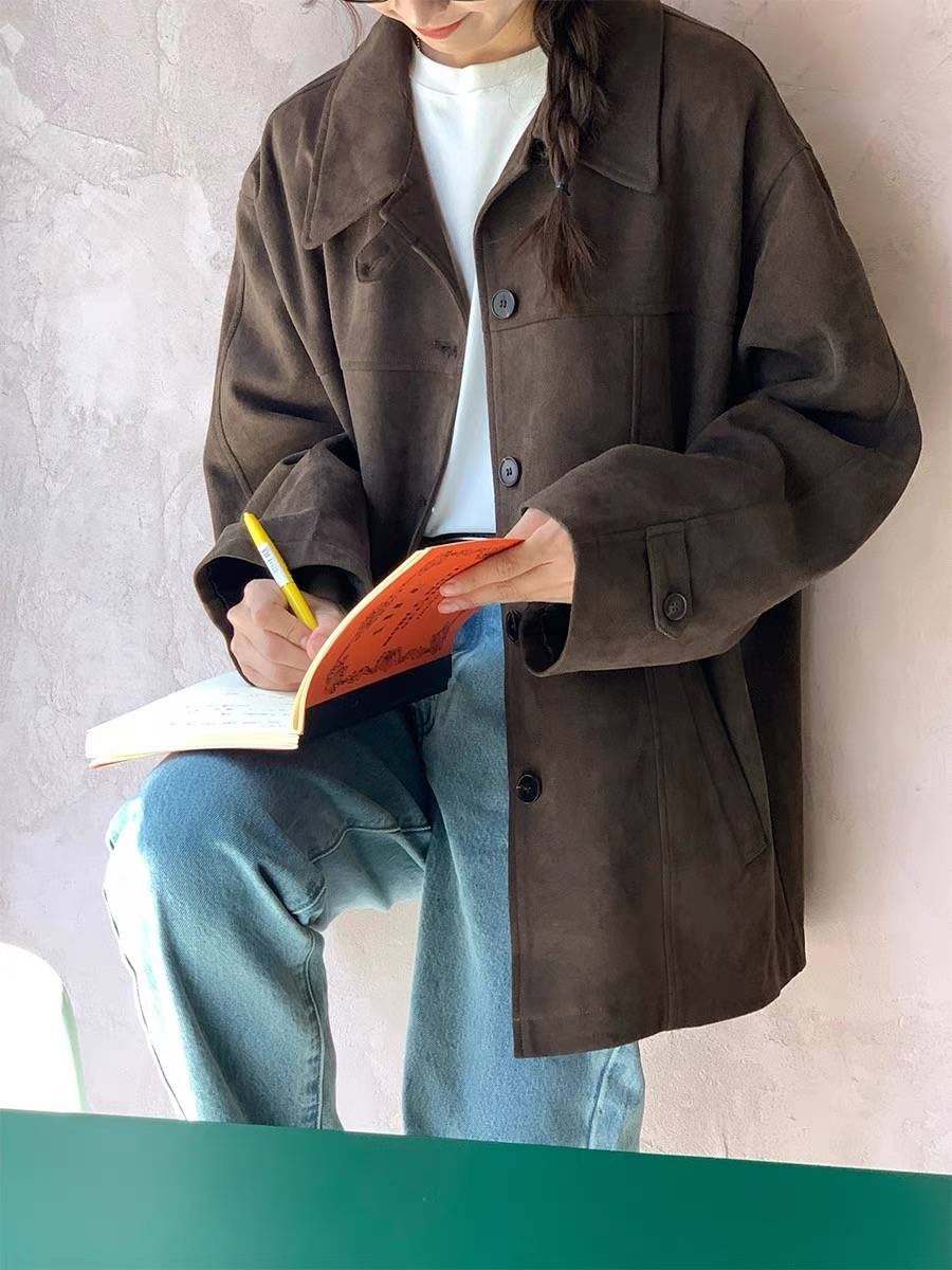 RAINY 麂皮绒夹克街头百搭美式复古春秋女宽松翻领机车中长款外套
