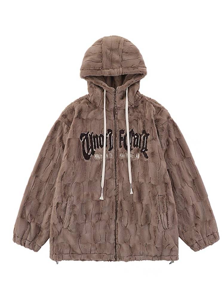 1896online冬季复古字母刺绣羊羔绒连帽棉衣女宽松加厚保暖棉服潮