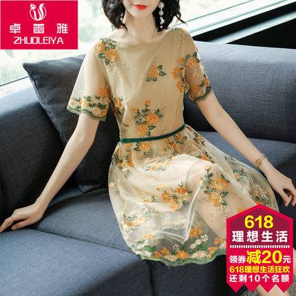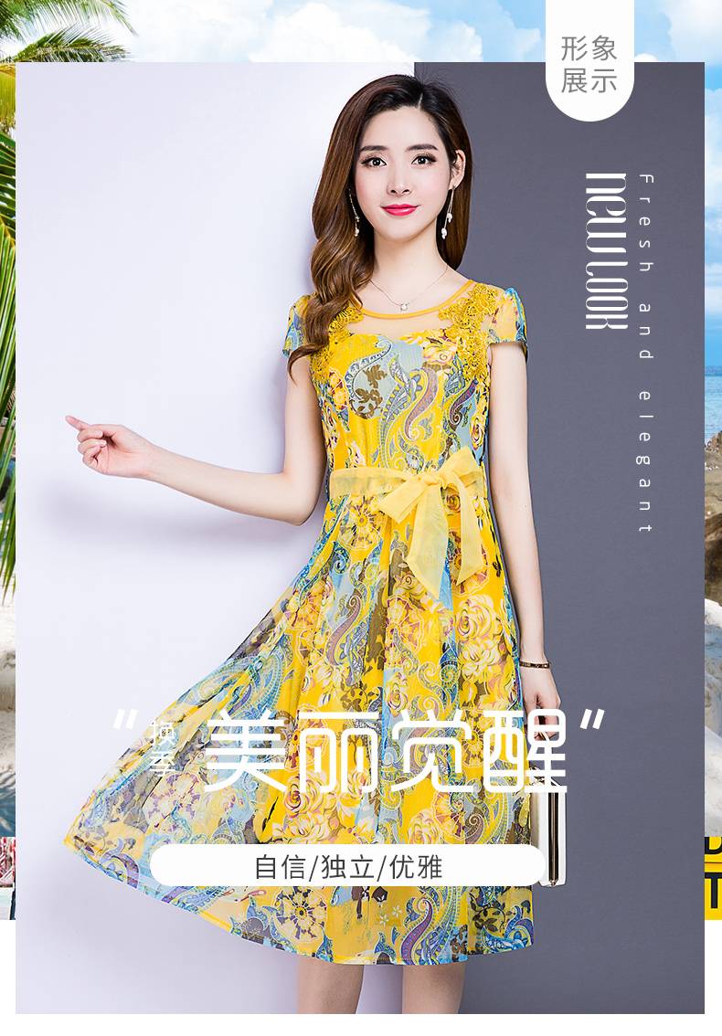 2018新款女装夏修身高腰中长款连衣裙女雪纺收腰显瘦短袖v领长裙 158.00 已售:1件