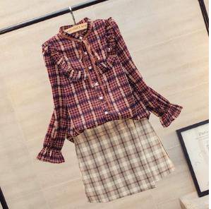 格子衬衫女2019新款立领系带木耳喇叭袖宽松百搭春季上衣女 韩版