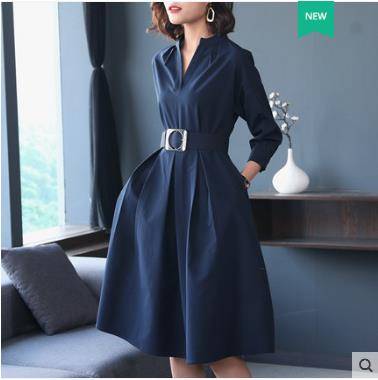 鹿歌2019春秋新款OL气质大摆裙子V领A字裙收腰显瘦中长款连衣裙女