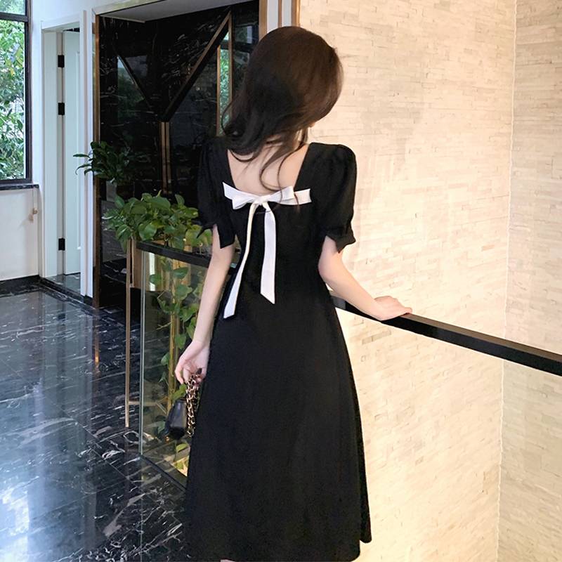 2021新款气质连衣裙泡泡袖蝴蝶结显瘦小黑裙
