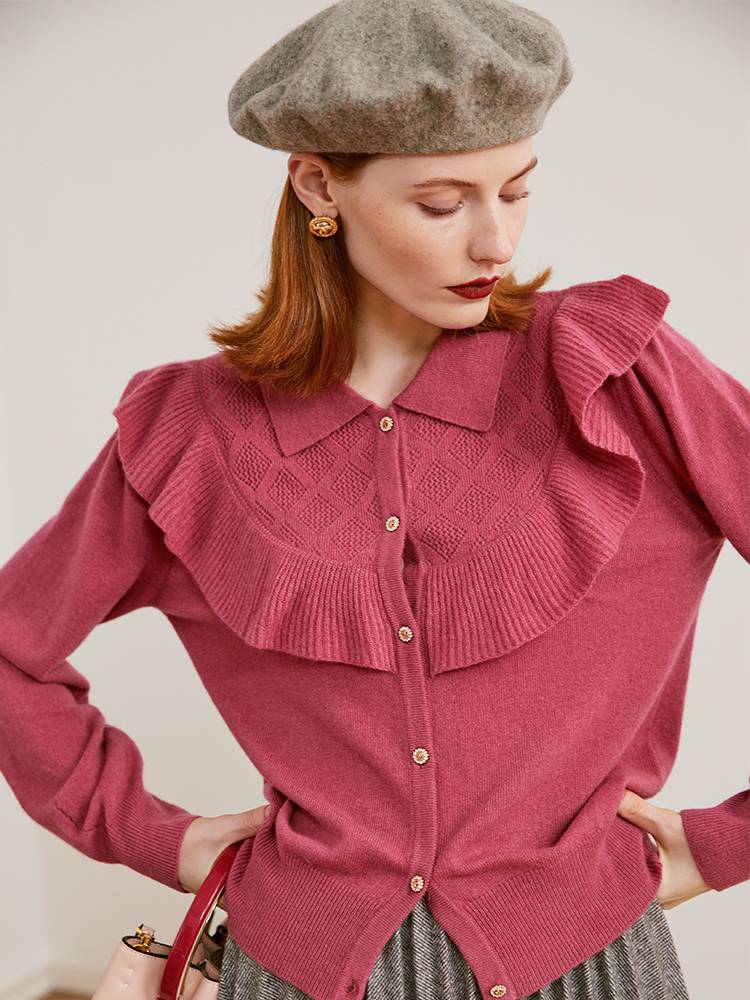 奥芝国 法式柔美风荷叶边针织衫上衣女3色镂空梅子色毛衣开衫外套