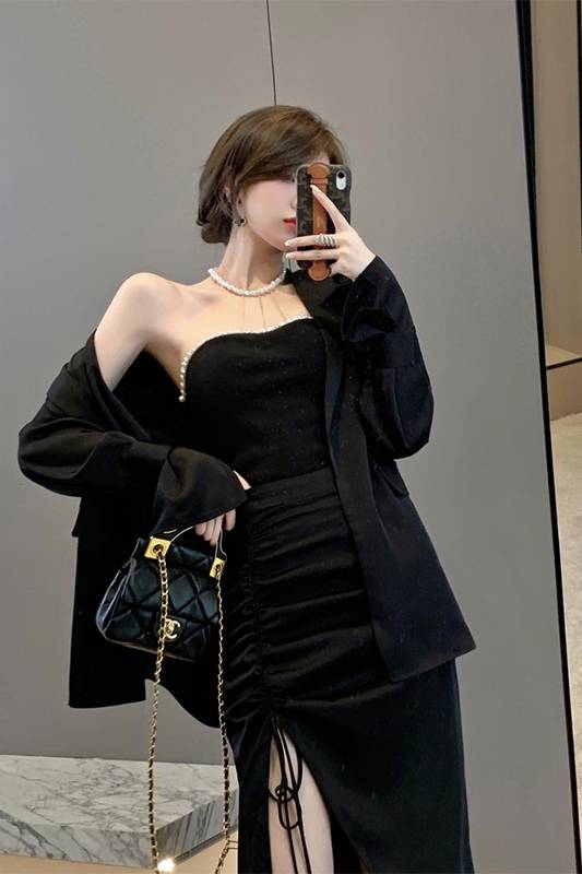 黑色缎面西服外套女士秋季宽松小众休闲中长款纽扣长袖西装领上衣