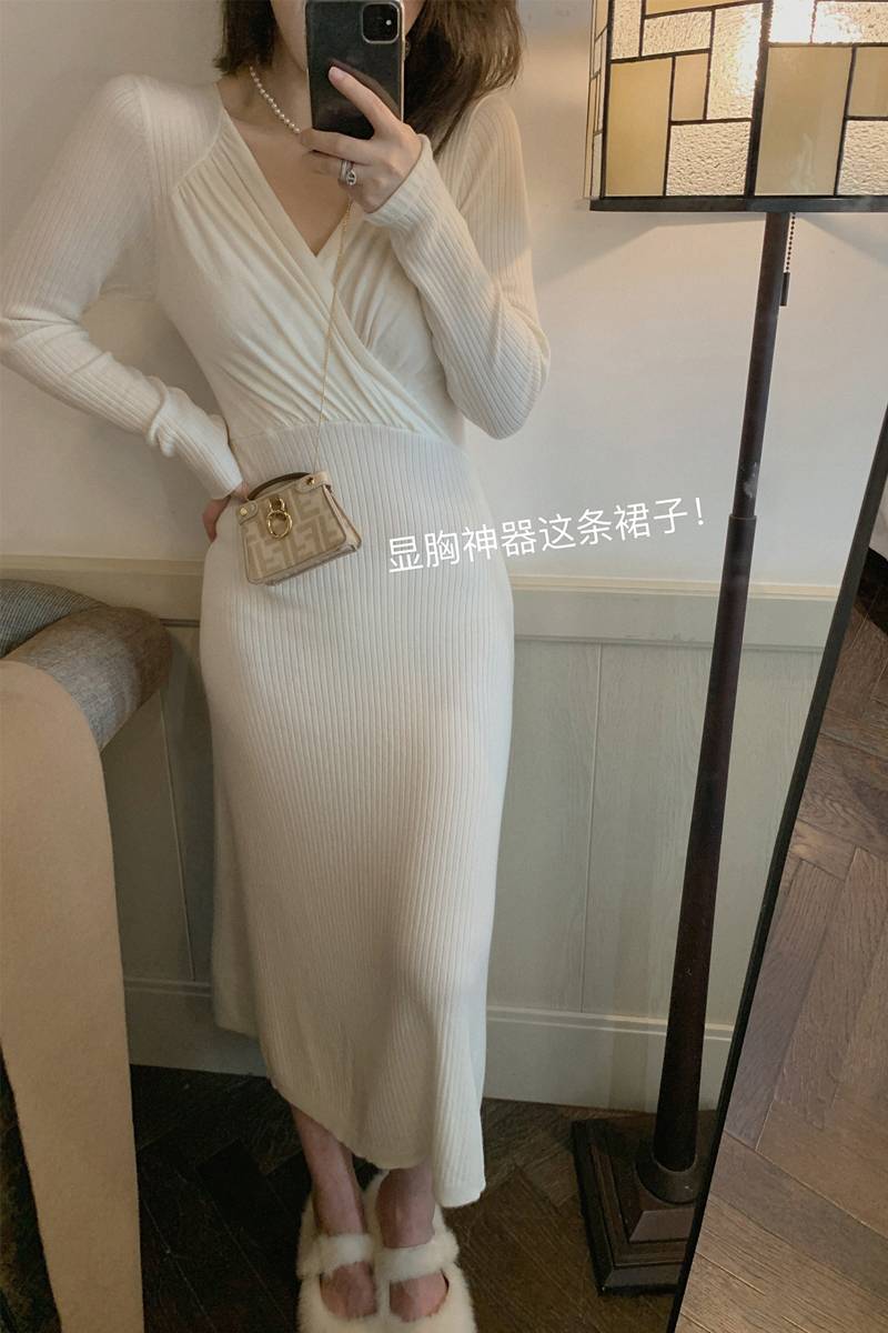 优雅捏褶V领收腰修身长款针织连衣裙女春秋
