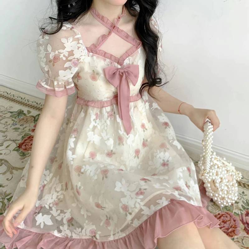泡泡袖蓬蓬公主裙夏季日系lolita可爱蝴蝶结泡泡袖仙女连衣裙萝莉