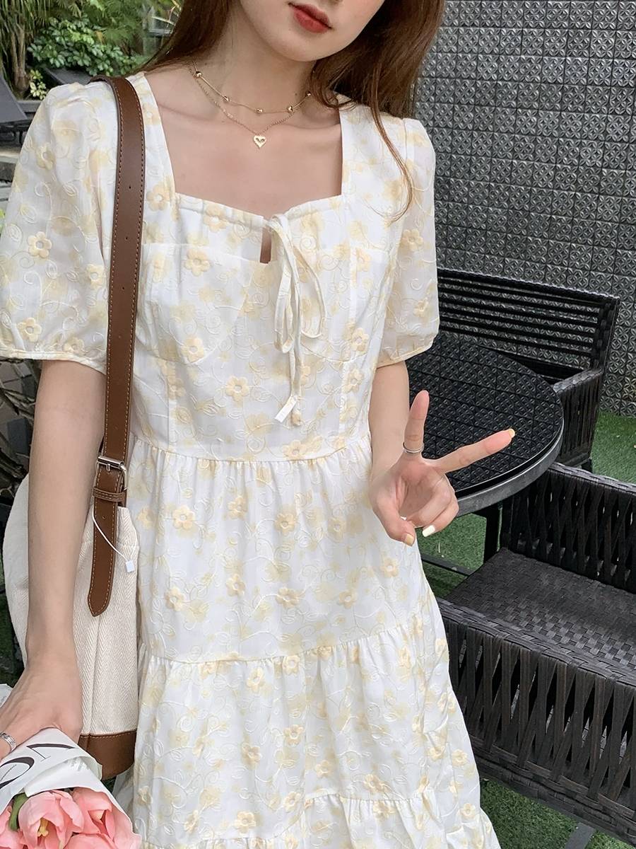 韩系绑带收腰方领泡泡袖蓬蓬碎花连衣裙中长款夏2022新款
