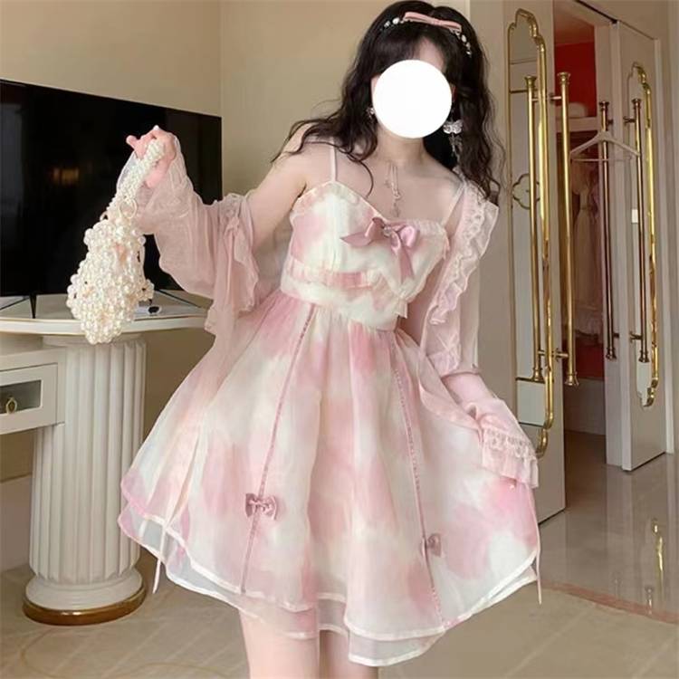 温柔风晕染蝴蝶结仙女吊带裙2022夏季新款超仙欧根纱甜美连衣裙子
