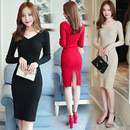 2021秋冬女装气质修身v领毛衣打底裙长款过膝开叉包臀针织连衣裙