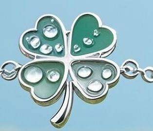 - 四叶草部分:四叶草叶片以高品质珐琅工艺上色,色彩饱满鲜亮,呈现出自然清新的绿色。珐琅材质不仅赋予了叶片丰富的色泽,还增强了其耐磨度和抗腐蚀性,长久佩戴依然亮丽如新。叶片上的露珠造型,采用透明锆石镶嵌,在光线的折射下,闪烁出晶莹光芒,为手链增添灵动之感。