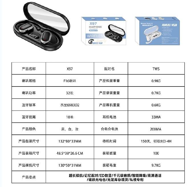 X97挂耳式跨境新款高音质佩戴舒适蓝牙5.3长续航智能数显私模通用 .