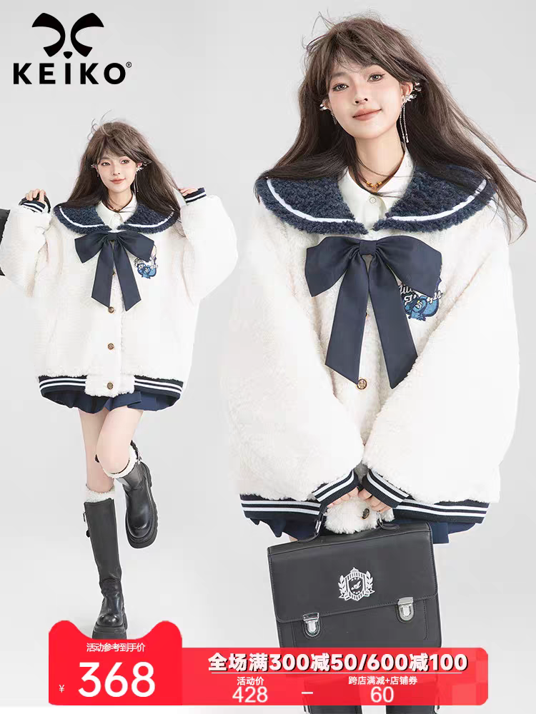KEIKO 减龄海军领白色羊羔毛绒外套棉服24冬季甜系蝴蝶结保暖棉袄