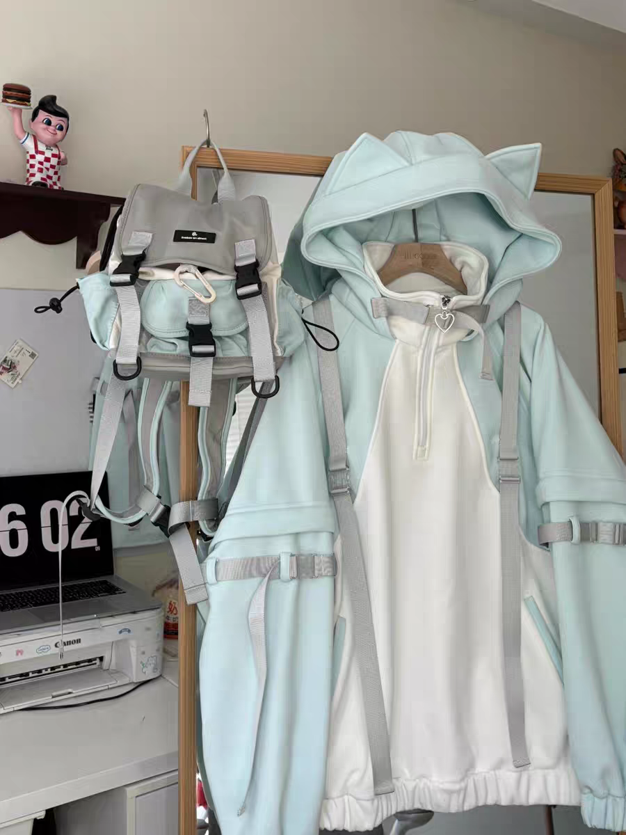 日系亚萌设计感撞色插肩连帽卫衣女秋冬慵懒甜美oversize帽衫外套