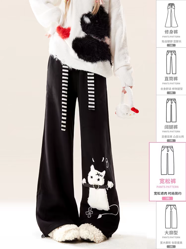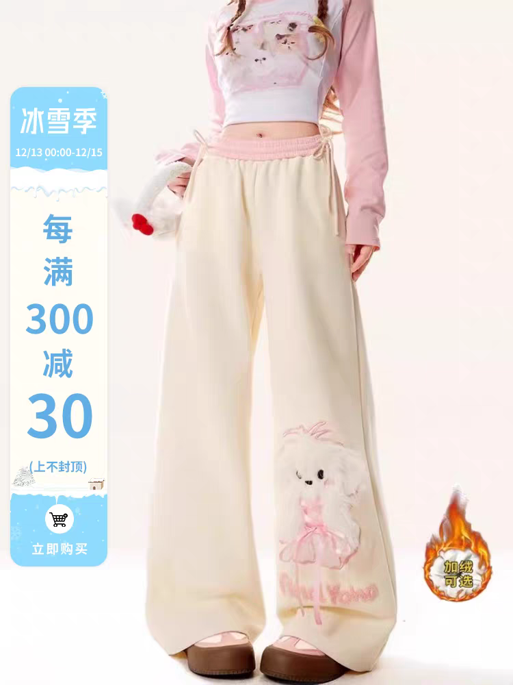 自然涩小狗加绒阔腿裤子女秋冬休闲百搭直筒宽松运动休闲卡通卫裤