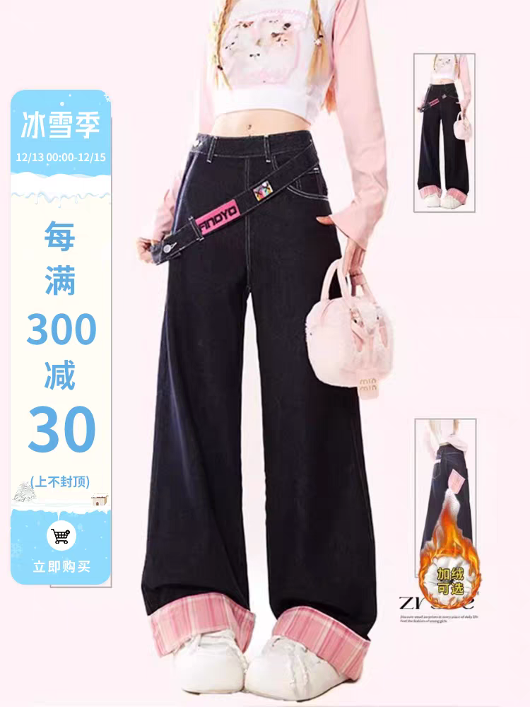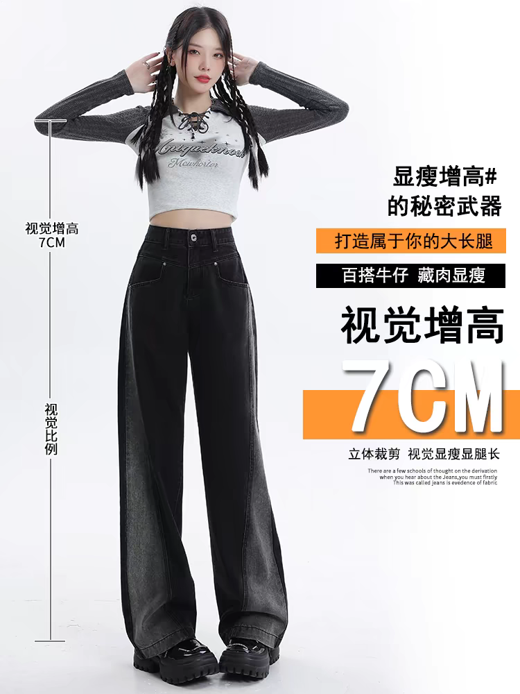 黑色阔腿牛仔裤女高腰黑白撞色设计感宽松直筒窄版加绒拖地长裤子