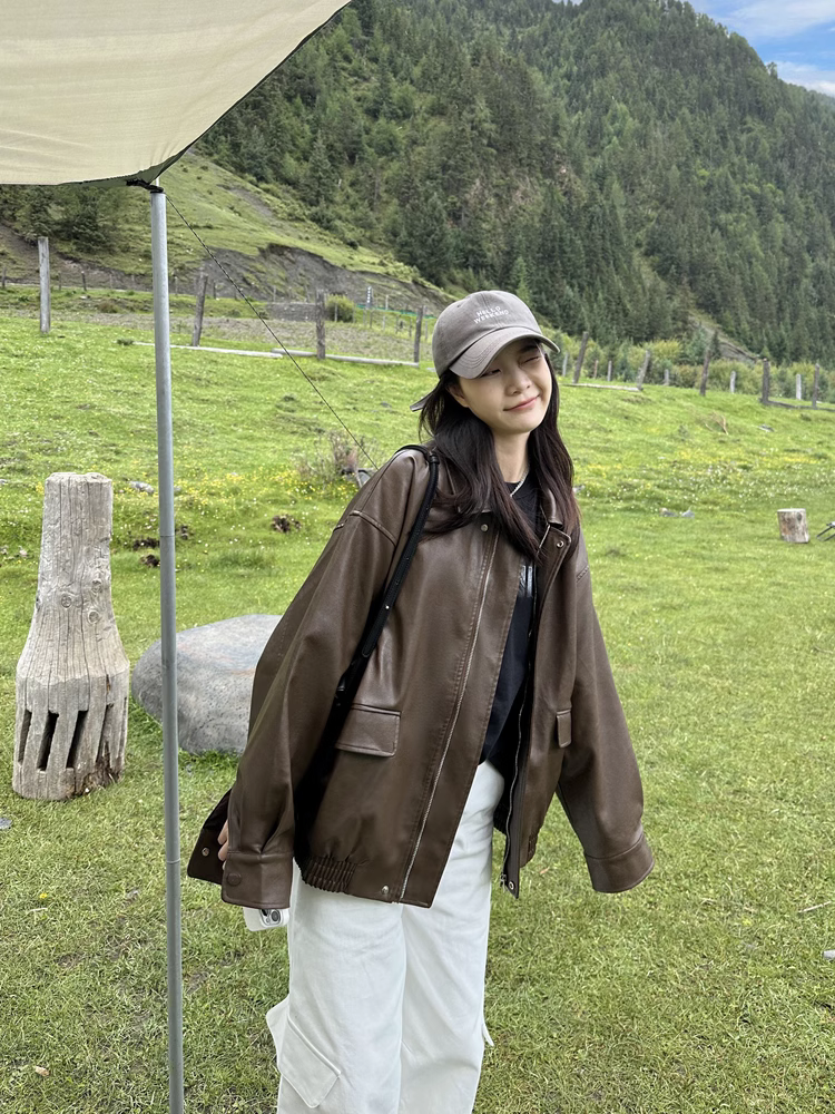 皮衣外套女2023新款春秋女上衣港式复古机车棕色美式皮夹克小个子
