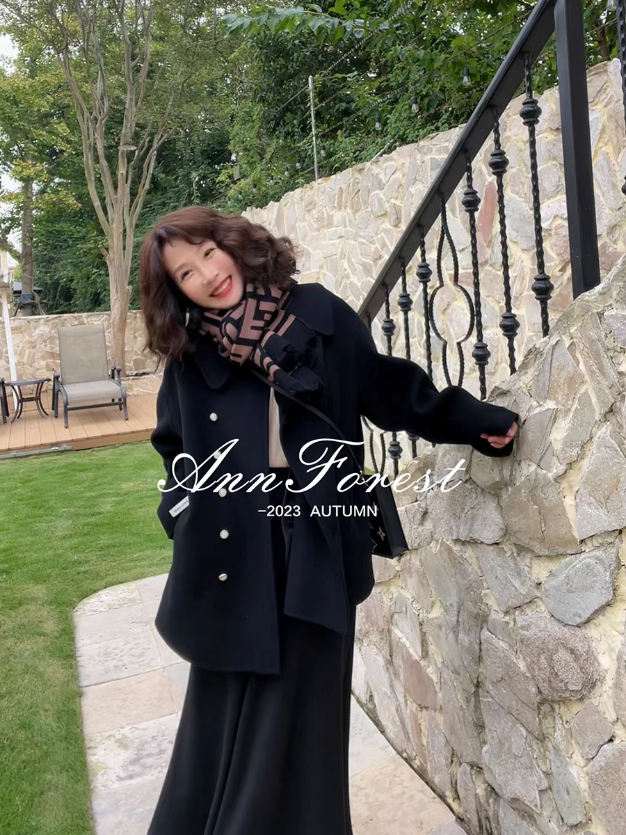优雅笔记安妮森林 赫本黑色猫眼扣双面呢大衣外套冬H版型宽松