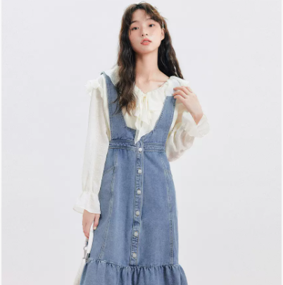 乐町牛仔双色收腰背带裙2022夏季新款秋装女小个子乖巧气质连衣裙