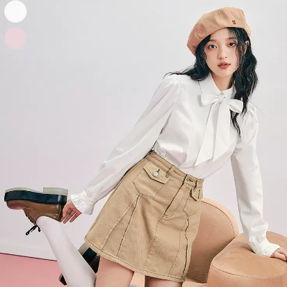 乐町气质领结衬衫2022秋季新款甜美白色上衣女宽松设计感小众