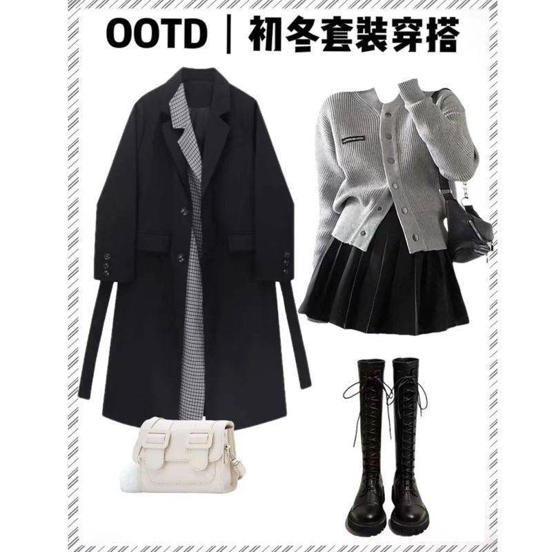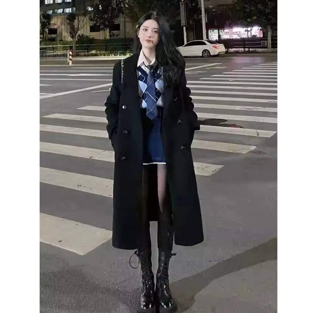 黑色毛呢外套女2023年秋冬宽松学院风中长款加厚赫本风过膝高档