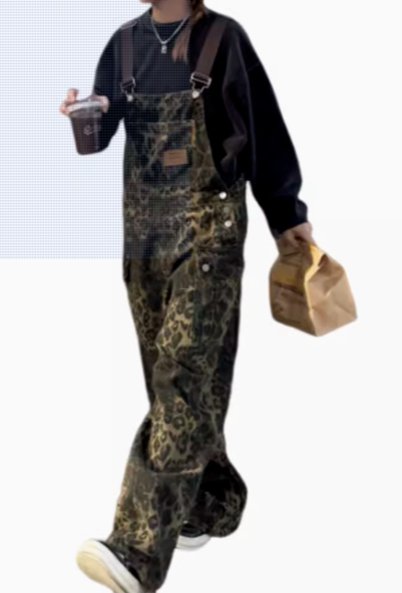 坤牌大码美式复古街头感vibe豹纹背带工装裤女春秋季宽松大口袋连体裤