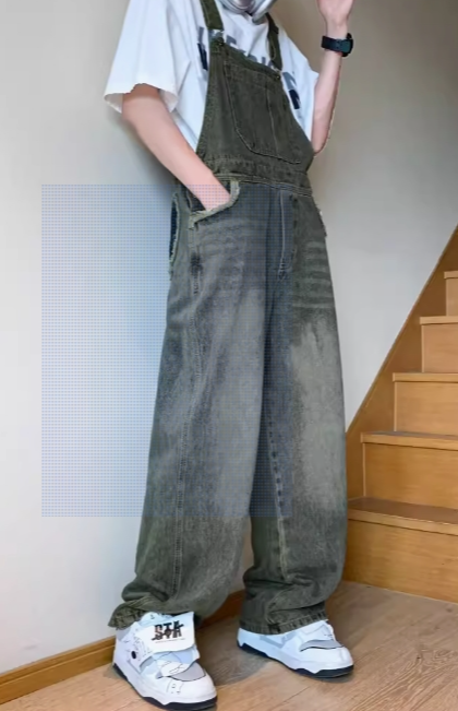 秋季潮牌泼墨设计牛仔背带裤男oversize韩版宽松复古美式工装长裤