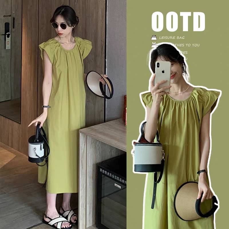 大码胖mm遮肚显瘦连衣裙女夏法式甜美牛油果绿气质减龄小飞袖裙子