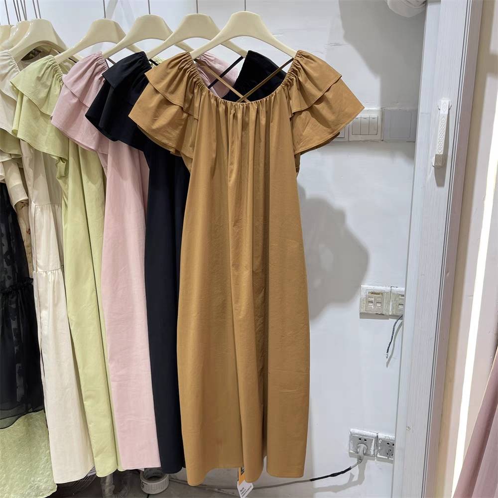 一字领飞飞袖纯色连衣裙女夏2023年新款收腰系带短袖长款A字裙子