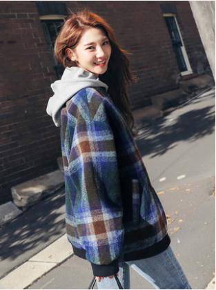 韩都衣舍2018韩版女装冬装新款宽松格子短款呢子毛呢外套HO9525魭