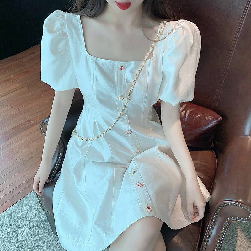 小个子洋气泡泡袖白色收腰连衣裙女夏2021新款法式仙女桔梗初恋裙