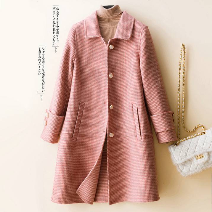 粉色毛呢格子小外套短款春装小个子双面羊绒羊毛大衣女