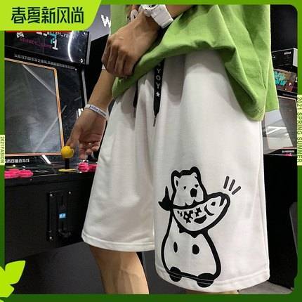 OvO胖子日系卡通直筒短裤男大码宽松港风ins百搭潮牌夏季沙滩五