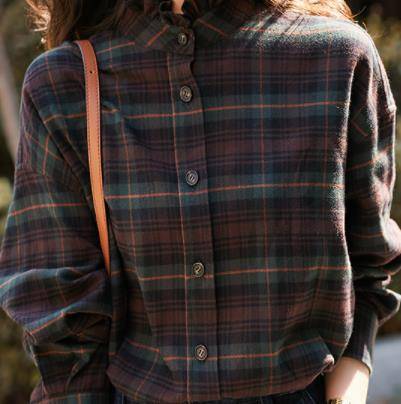 笑涵阁 复古时髦减龄 立领纯棉长袖宽松格纹衬衫女秋CY317152AG