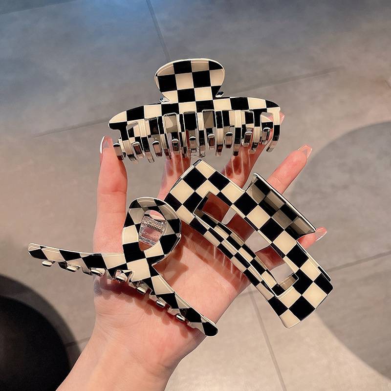 黑白格子棋盘格发夹网红个性后脑勺大号抓夹鲨鱼夹韩国秋冬款发饰