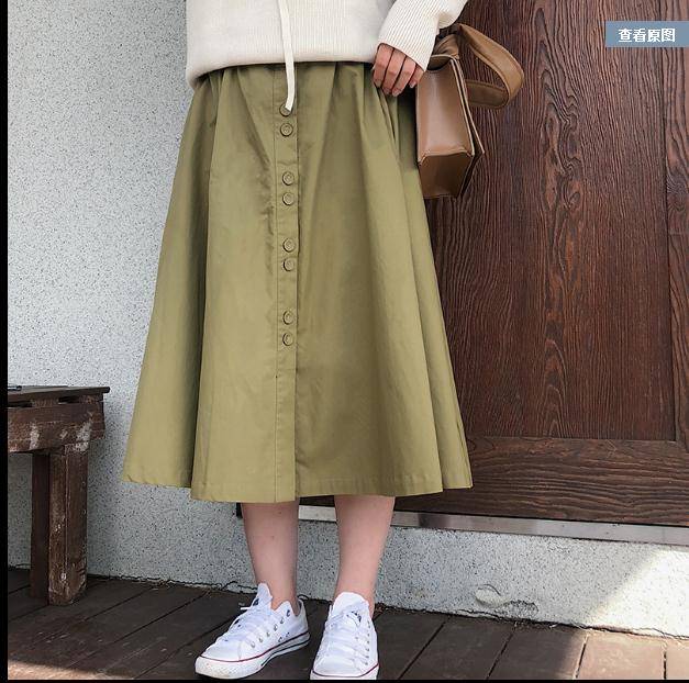 军绿色纽扣设计半身裙子女秋装松紧腰宽松显瘦大伞裙