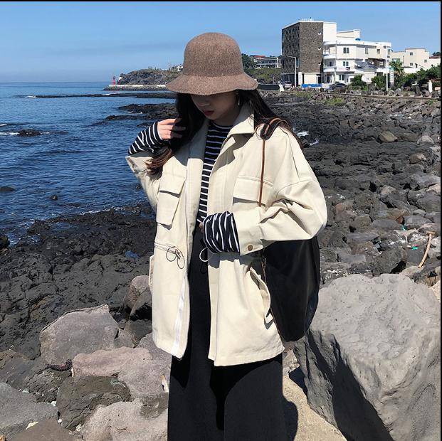 卡其色风衣女短款 口袋抽绳设计 春秋显瘦百搭小外套