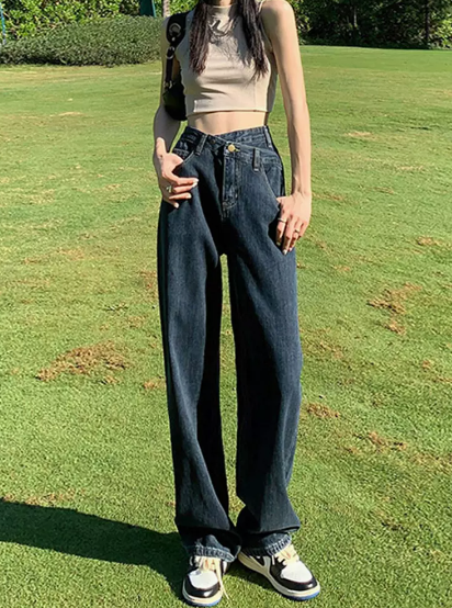 蓝灰色高腰阔腿牛仔裤女夏季新款交叉腰小个子宽松直筒拖地裤薄款