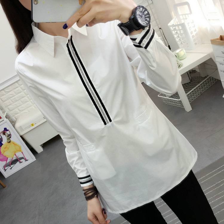 2018秋天新款韩版女装中长款翻领显瘦学生白色女士衬衣打底上衣女