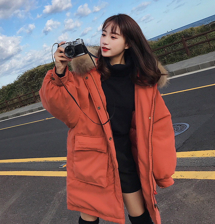 2018女冬季新款韩版大口袋中长款宽松加厚毛领连帽棉服ins风